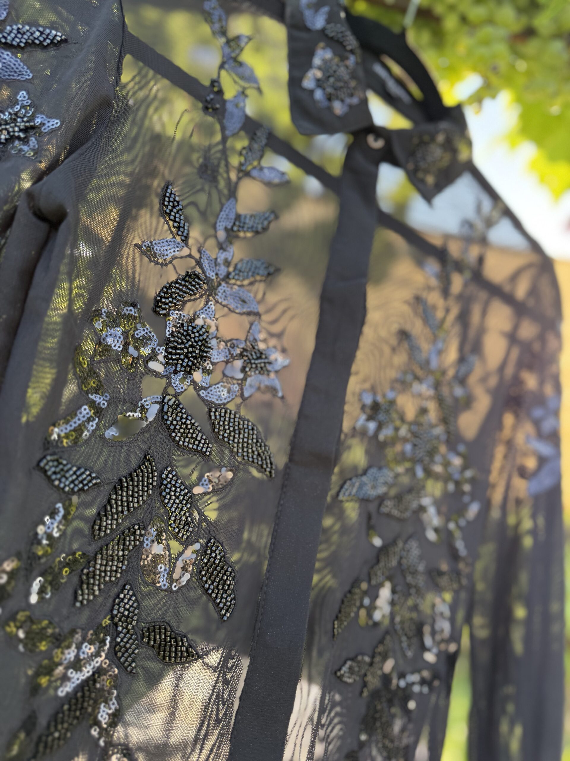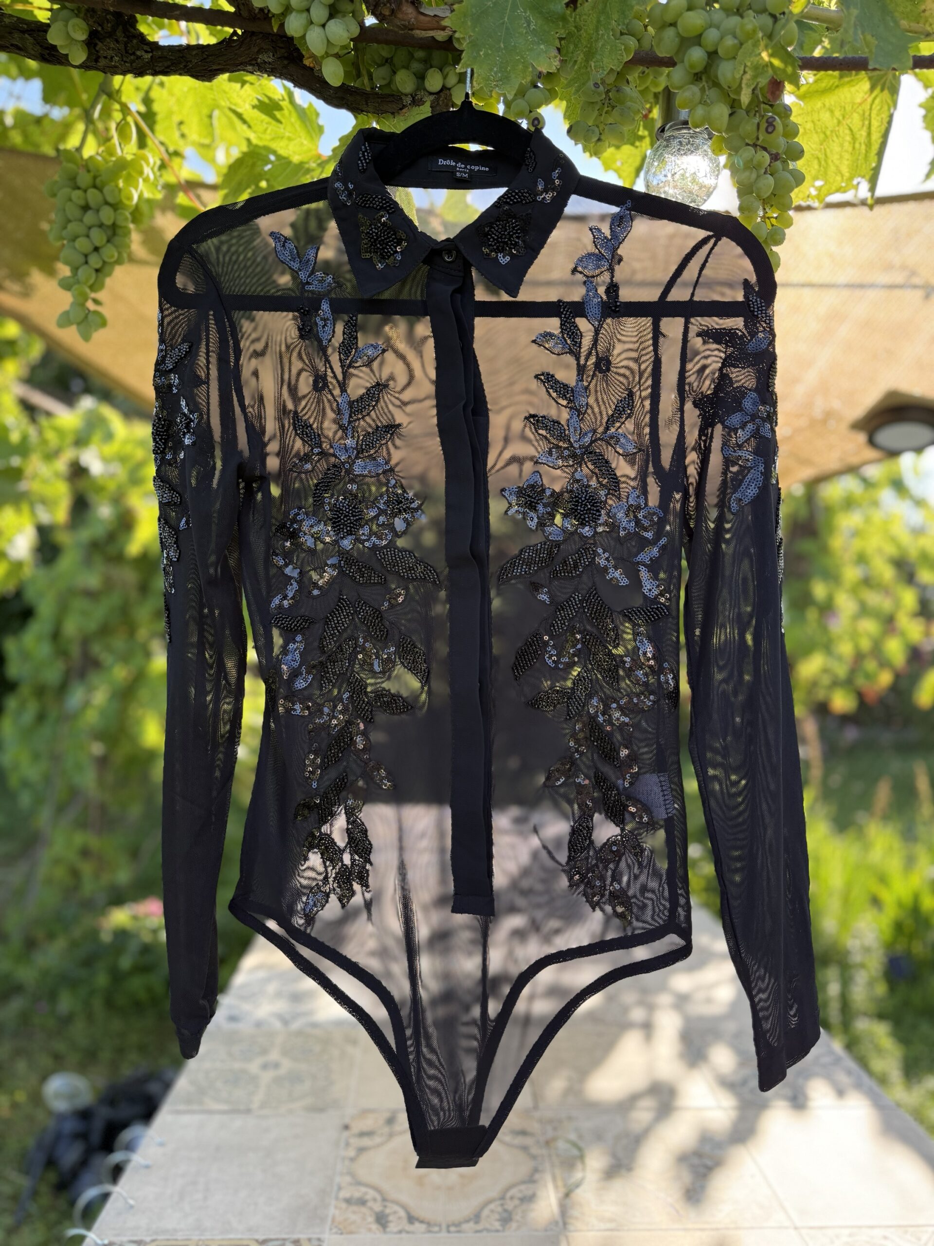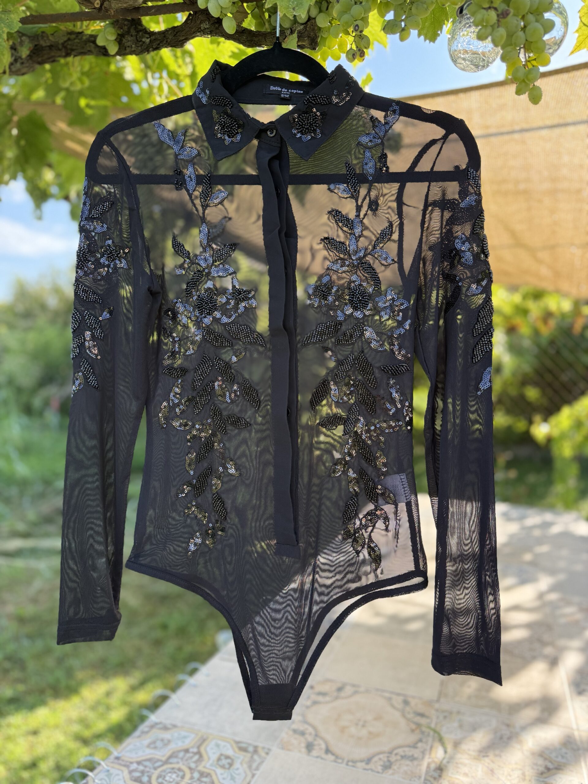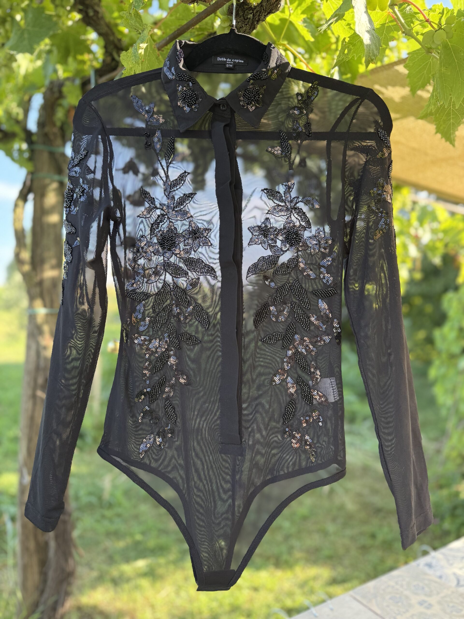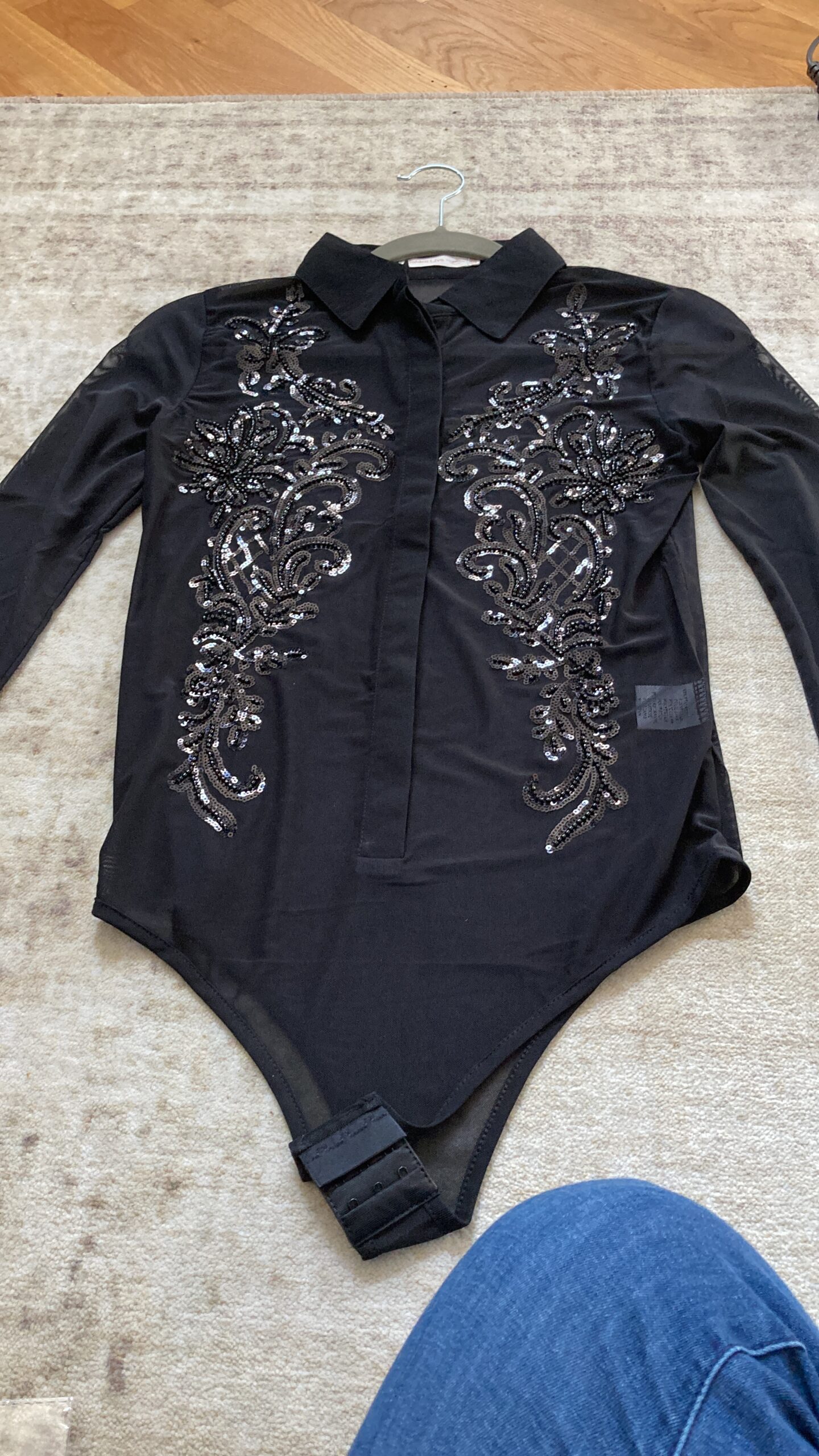 Hochwertige Bodybluse in Transparent mit schwarzen Pailletten und Druckknöpfen. Passt sich dem Körper perfekt an, ideal für Turniere.