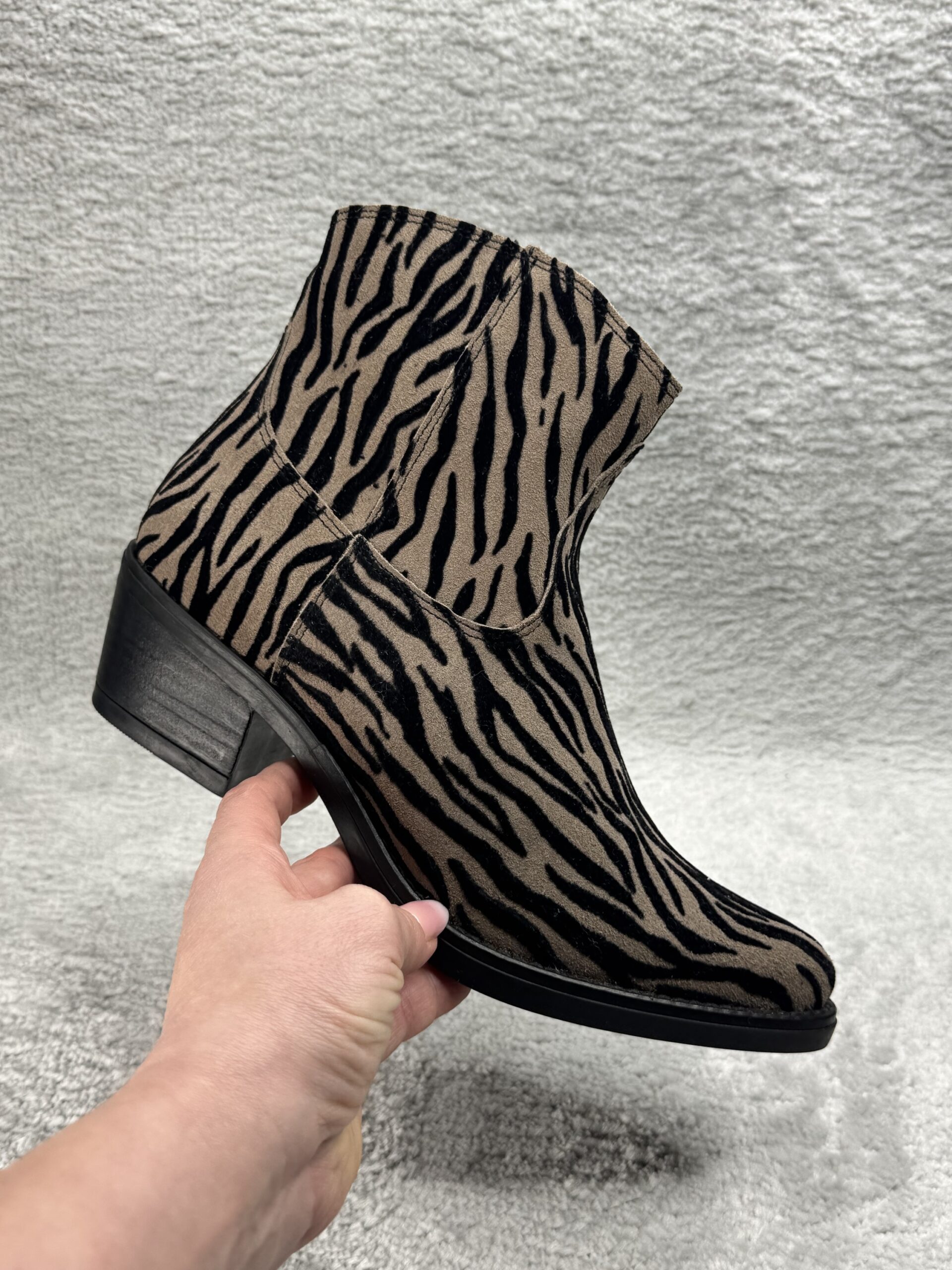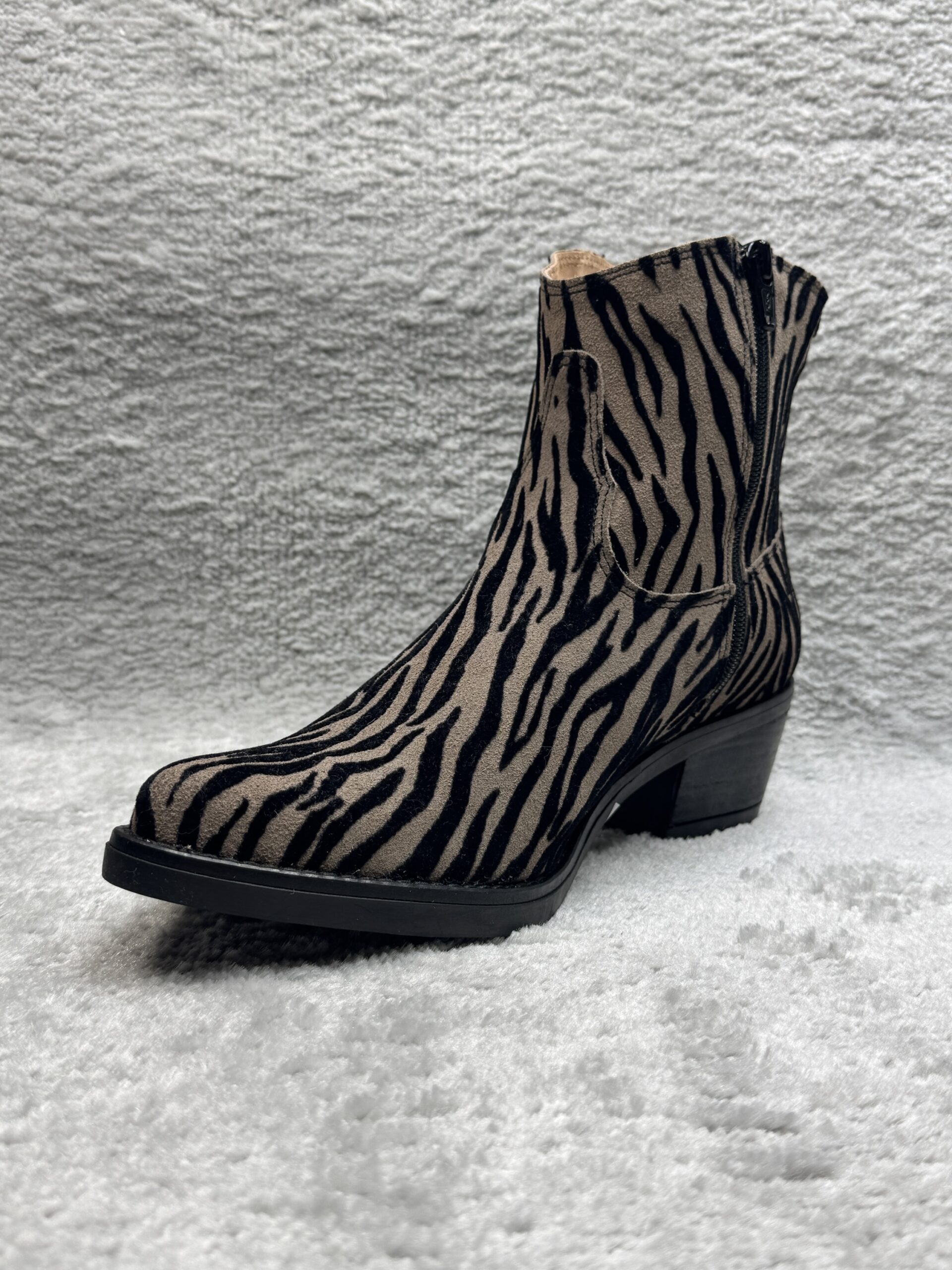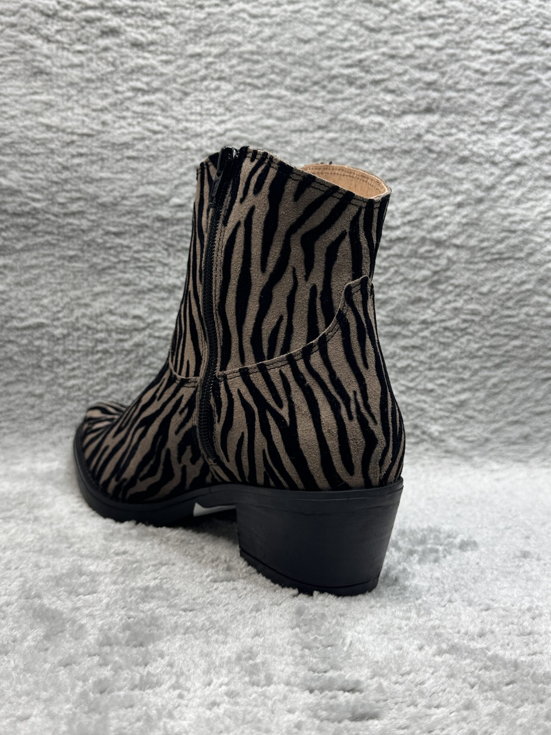 Diese Cowboy Stiefeletten für Damen vereinen modernes Design mit klassischem Western Flair Das auffällige Zebra Muster in Schwarz Taupe macht sie zu einem echten Hingucker während das hochwertige Veloursleder für eine edle Optik sorgt Der 5 cm hohe Blockabsatz bietet einen angenehmen Tragekomfort und eine feminine Silhouette