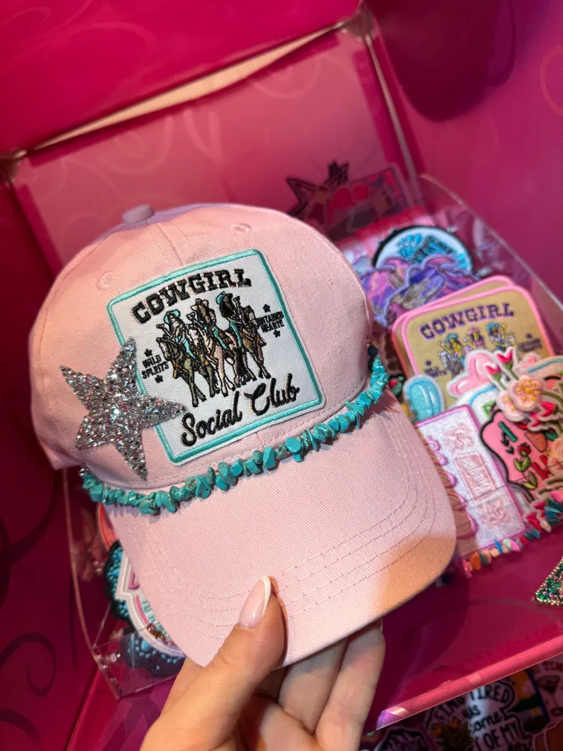 Diese rosa Trucker-Mütze ist mehr als nur ein Accessoire – sie ist ein Statement. Im Mittelpunkt steht ein auffälliger „Cowgirl Social Club“-Patch mit detailverliebter Stickerei und coolen Slogans wie „Wild Spirits“ und „Team Heart“. Ein silberner Glitzerstern bringt die Extraportion Funkeln, während türkisfarbene Dekosteine die Cap rundum veredeln