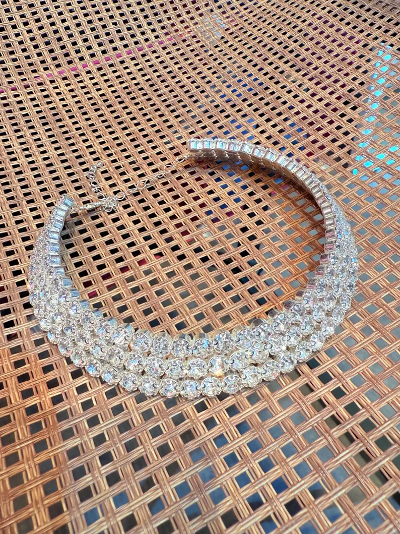 Die breiten, dicht gefassten Strassreihen glitzern intensiv im Licht und setzen ein starkes Statement. Dank des Verlängerungskettchens kannst du die Länge flexibel anpassen – angenehm zu tragen, auffällig im Stil.