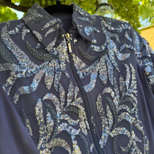 Farbe: BlauMaterial : Unterstoff: 95 % Viskose, 5 % Elasthan – Oberstoff: 100 % PolyesterHochwertige Glitzer-Showjacke mit verstärktem Kragen und Schulterpolstern, Glitzer und Glamour aus allen BlickwinkelnNur HandwäscheMade in Germany Größe Produkt Brust Taille Hüfte Armlänge Gesamtlänge XS Show Jacket neu 88 72 88 68 cm kann auf Wunsch gekürzt werden 60 cm S Show…