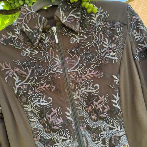 Farbe: OliveMaterial : Unterstoff: 95 % Viskose, 5 % Elasthan – Oberstoff: 100 % PolyesterHochwertige Glitzer-Showjacke mit verstärktem Kragen und Schulterpolstern, Glitzer und Glamour aus allen BlickwinkelnNur HandwäscheMade in Germany Größe Produkt Brust Taille Hüfte Armlänge Gesamtlänge XS Show Jacket neu 88 72 88 68 cm kann auf Wunsch gekürzt werden 60 cm S Show…