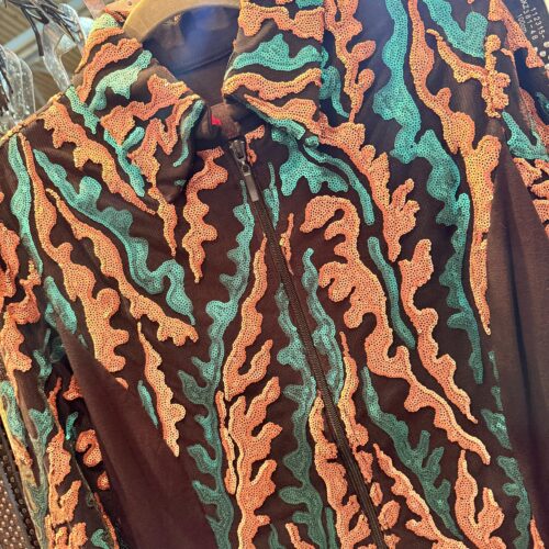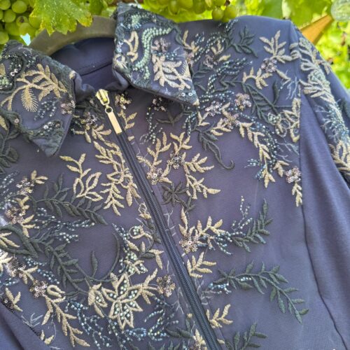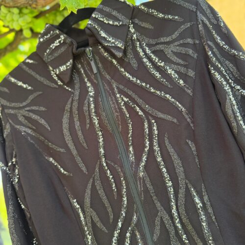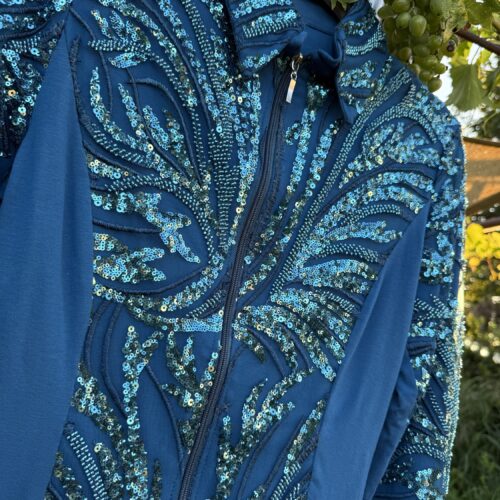Farbe: Schwarz | Türkis | BronzeMaterial : Unterstoff: 95 % Viskose, 5 % Elasthan – Oberstoff: 100 % PolyesterHochwertige Glitzer-Showjacke mit verstärktem Kragen und Schulterpolstern, Glitzer und Glamour aus allen BlickwinkelnNur HandwäscheMade in Germany Größe Produkt Brust Taille Hüfte Armlänge Gesamtlänge XS Show Jacket neu 88 72 88 68 cm kann auf Wunsch gekürzt werden…