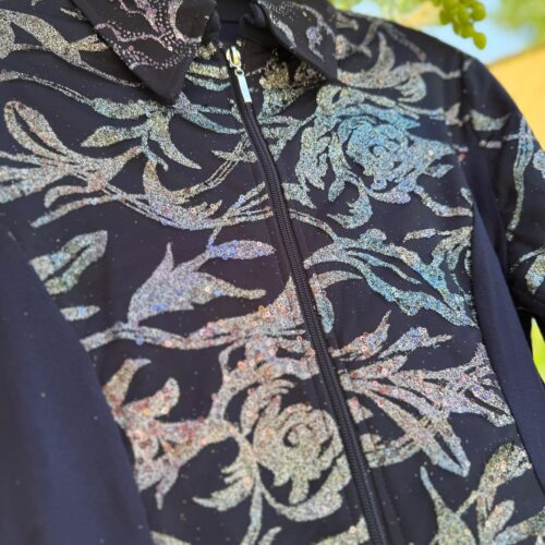 Farbe: Black | Colorful Material : Unterstoff: 95 % Viskose, 5 % Elasthan – Oberstoff: 100 % PolyesterHochwertige Glitzer-Showjacke mit verstärktem Kragen und Schulterpolstern, Glitzer und Glamour aus allen BlickwinkelnNur HandwäscheMade in Germany Größe Produkt Brust Taille Hüfte Armlänge Gesamtlänge XS Show Jacket neu 88 72 88 68 cm kann auf Wunsch gekürzt werden 60 cm…