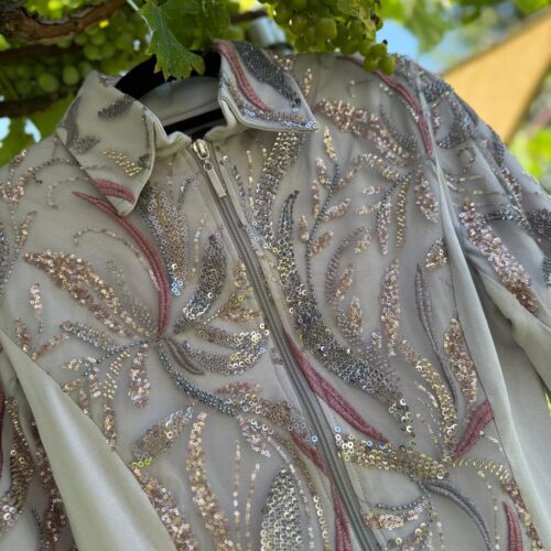 Farbe: gebrochenes Weiß Material : Unterstoff: 95 % Viskose, 5 % Elasthan – Oberstoff: 100 % PolyesterHochwertige Glitzer-Showjacke mit verstärktem Kragen und Schulterpolstern, Glitzer und Glamour aus allen BlickwinkelnNur HandwäscheMade in Germany Größe Produkt Brust Taille Hüfte Armlänge Gesamtlänge XS Show Jacket neu 88 72 88 68 cm kann auf Wunsch gekürzt werden 60 cm…
