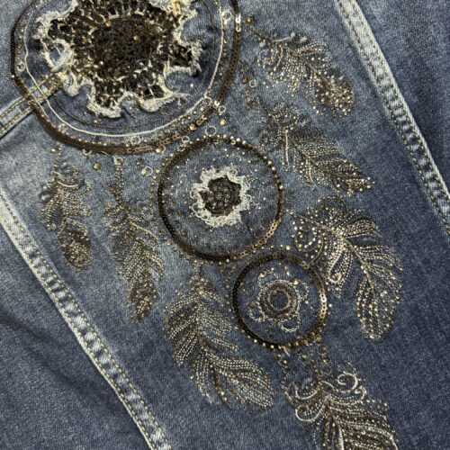 Wunderschöne Jeansjacke mit großflächigem und glitzernden Rückenmotiv. 94% Baumwolle 4% Polyester 2% Elastan viele Strasssteine