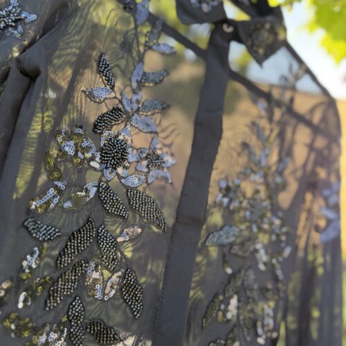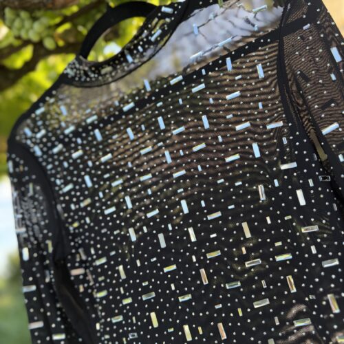 Farbe: Black Material: 95 % Polyester, 5 % Elasthan Hochwertige Bodybluse in Transparent mit schwarzen Pailletten und Druckknöpfen. Passt sich dem Körper perfekt an, ideal für Turniere. Größe Brust Taille Hüfte Arm S/M 78 70 76 56 M/L 80 72 80 57