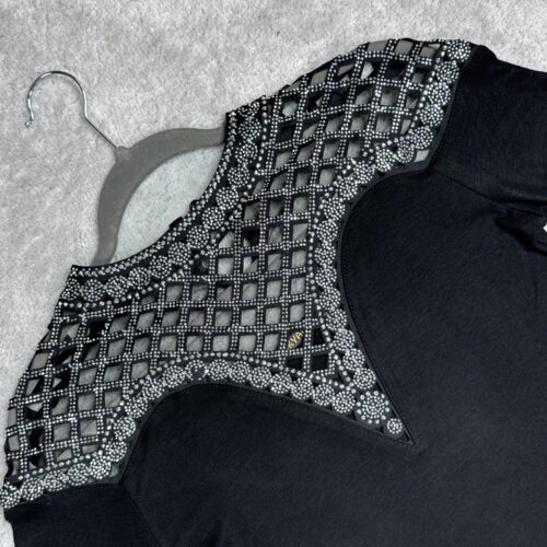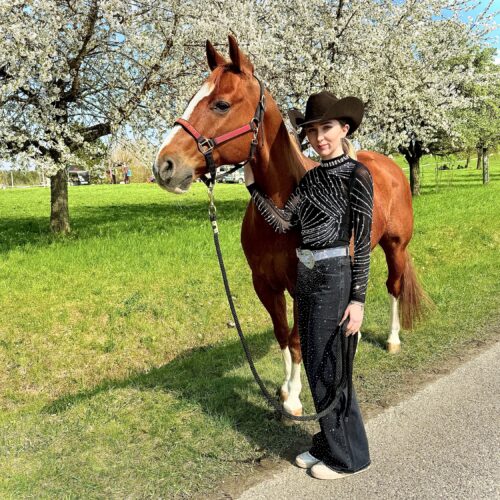 Schwarze Westernbluse Damen – Elegant & Perfekt für Turniere Entdecke unsere hochwertige Westernbluse für Damen – die perfekte Wahl für Turniere und stilvolle Western-Outfits. Gefertigt aus einem hochwertigen Materialmix aus 95 % Baumwolle und 5 % Lycra, bietet sie eine optimale Passform und hohen Tragekomfort. Das edle Design mit funkelnden Strasssteinen verleiht dir einen glamourösen…